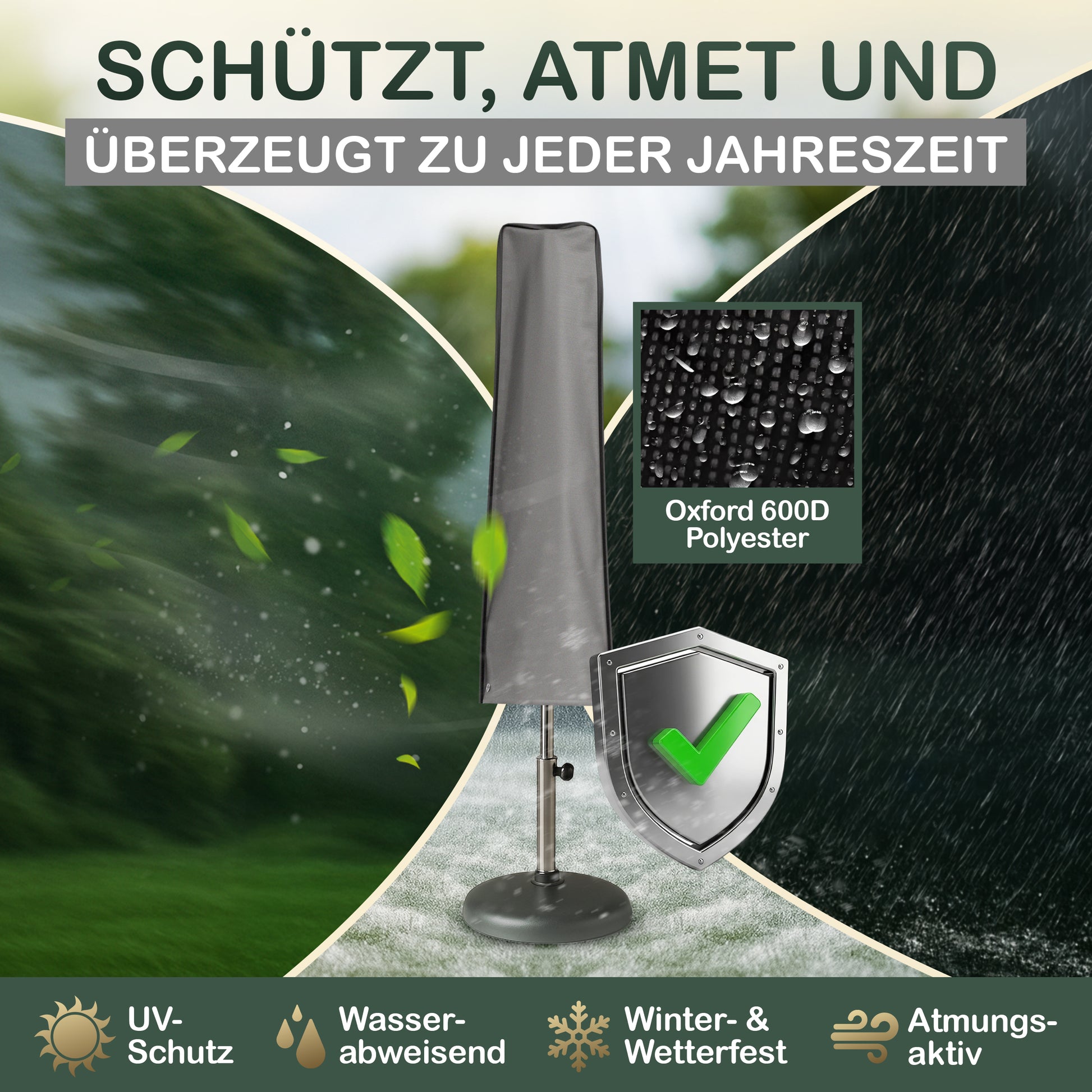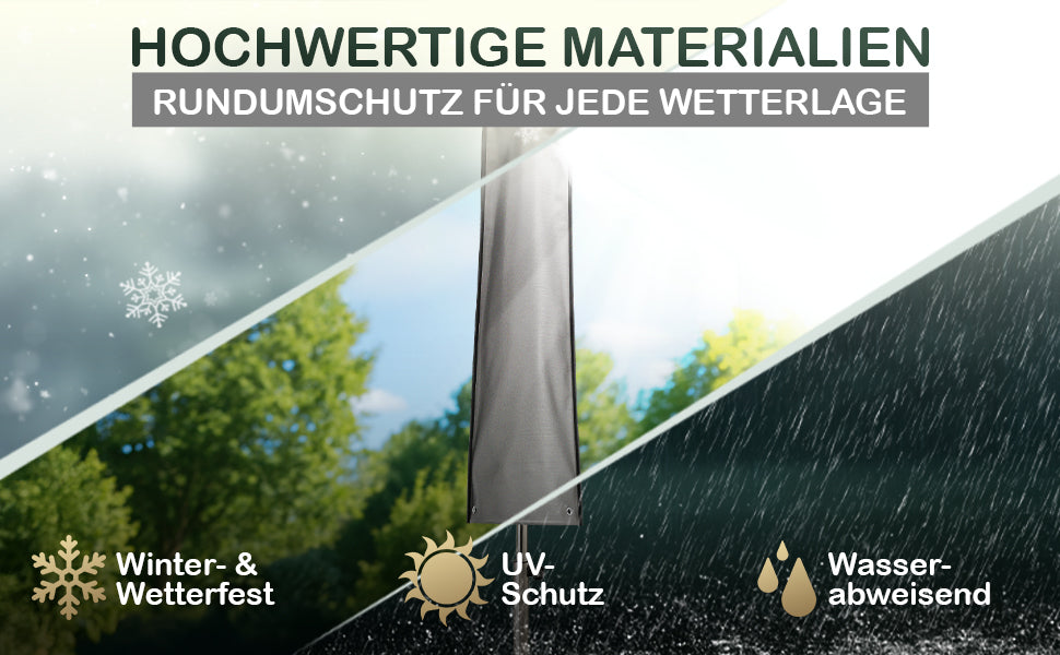 - Hochwertige Materialien: Das robuste Oxford 600D Material sorgt dafür, dass die Hülle langlebig und strapazierfähig ist. Es ist UV-beständig und wasserabweisend, was bedeutet, dass Ihre Schirmhülle vor Verblassen und Beschädigungen durch Umwelteinflüsse geschützt ist.